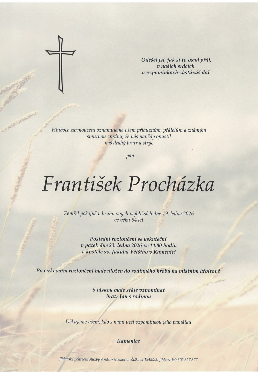 František Procházka 23.1. 2026 - 14:00 kostel sv. Jakuba Většího, Kamenice u Jihlavy Zobrazit v plné velikosti